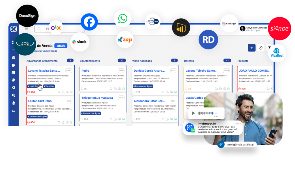 A IMOBMEET é uma plataforma de vendas com módulos integrados que organizam, automatizam e escalam sua rotina comercial, do atendimento à gestão de recebíveis.